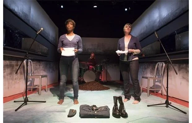 The actors stand behind microphones at opposite ends of a sparsely decorated set while they read from the interview transcript. A folded military jacket and combat boots sit centre stage as a dividing line.
